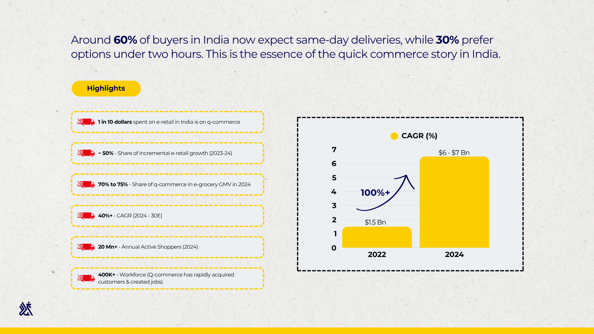 Around 60% of buyers in India now expect same-day deliveries, while 30% prefer options under two hours. This is the essence of the quick commerce story in India.