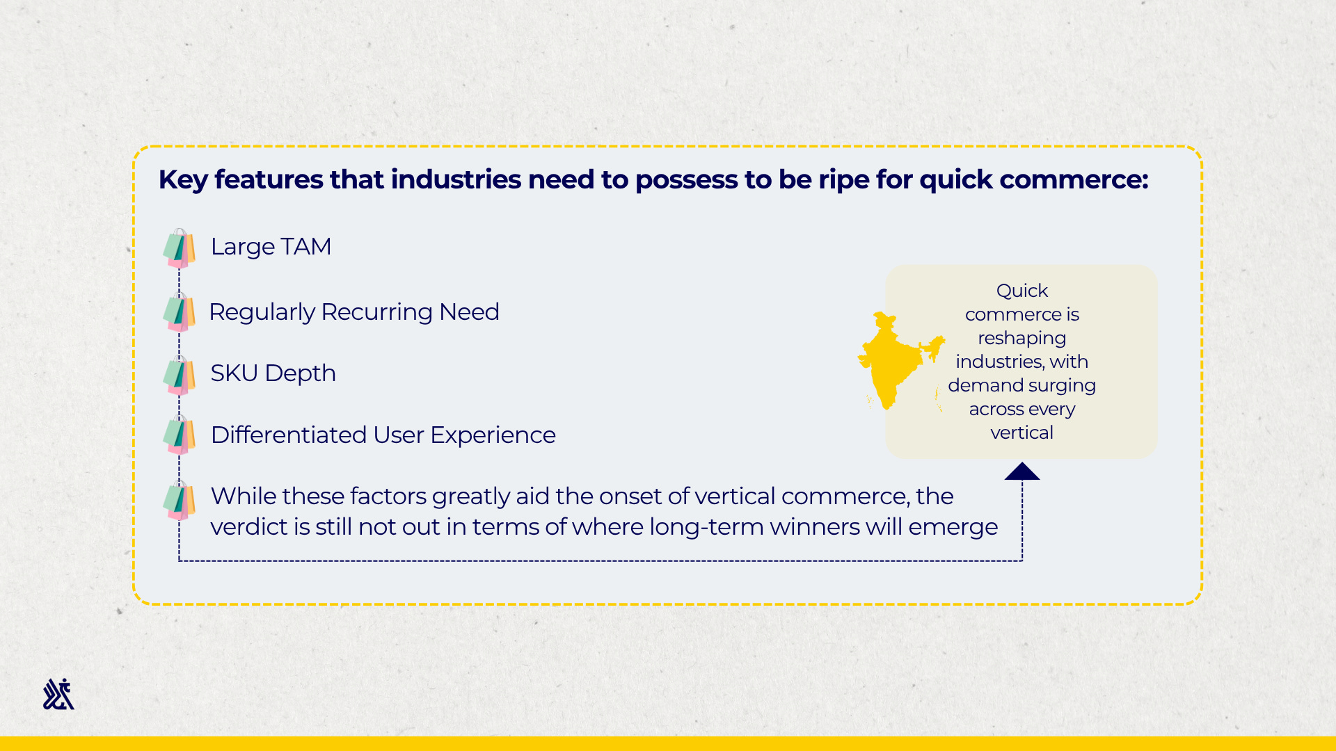 As a result, we are frequently seeing founders wanting to leverage the frameworks of quick commerce in new domains and verticals. While the use cases for quick commerce are quite versatile, there are a few key features that industries need to possess to be ripe for quick commerce: